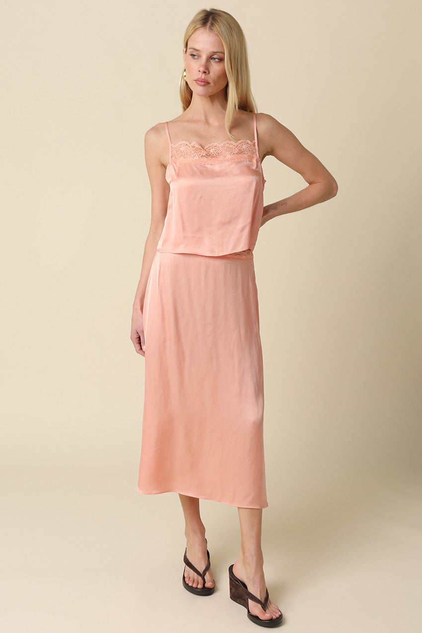 Our Belle Lace-Trim Satin Top features a soft satin fabric with delicate lace trim at the neckline, and adjustable spaghetti straps for a customizable fit.